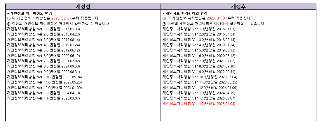 고객사 사이트 개인정보처리방침 개정 안내 (2025.04.04)