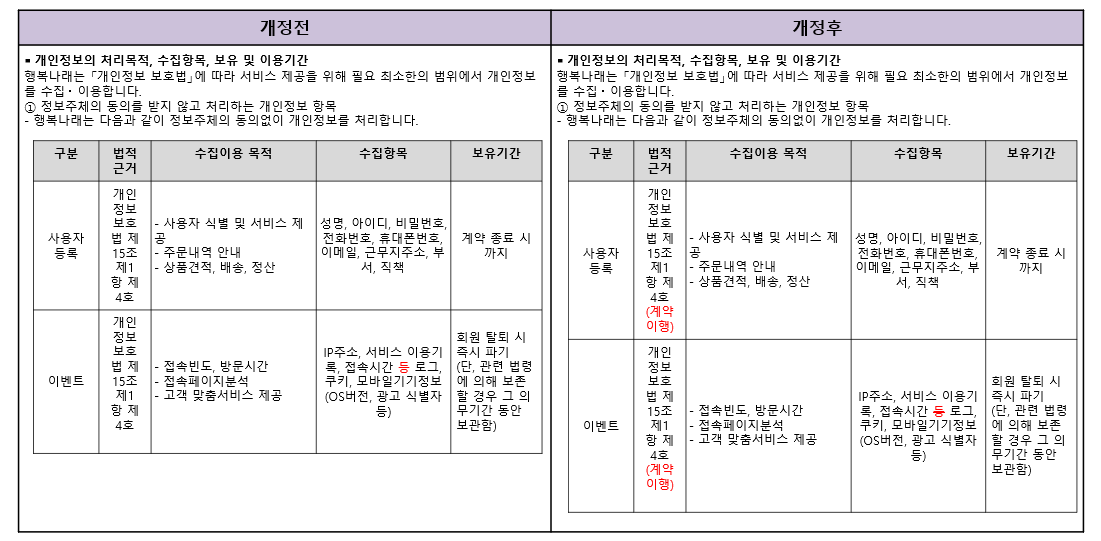 행복나래 고객사 페이지(MP) 개인정보 처리방침이 아래와 같이 변경되어 상세내용을 사전 고지 드리오니 서비스 이용에 참고해 주시기 바랍니다.