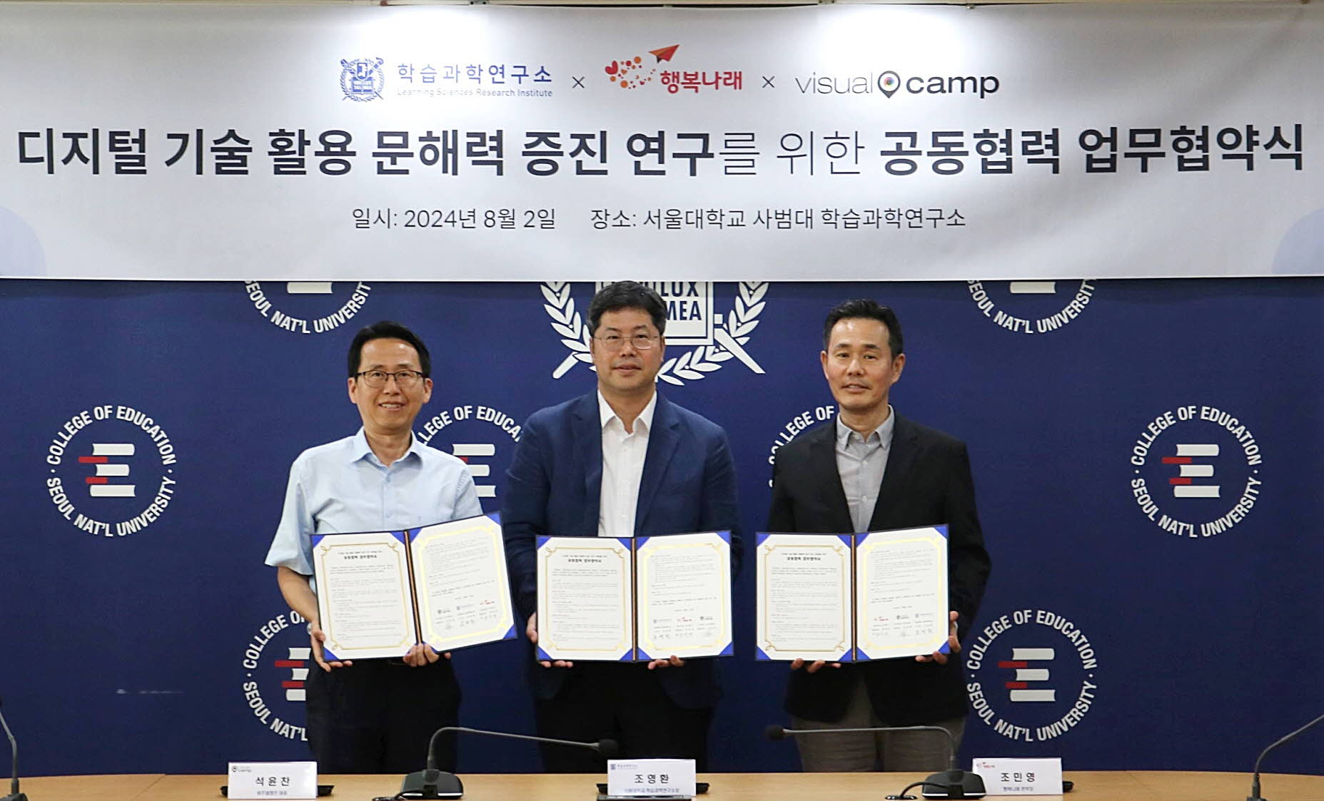 지난 2일 서울대학교에서 진행된 협약식에는 조민영 행복나래 본부장, 조영환 서울대학교 사범대학 학습과학연구소 소장, 석윤찬 비주얼캠프 대표가 참석했다.