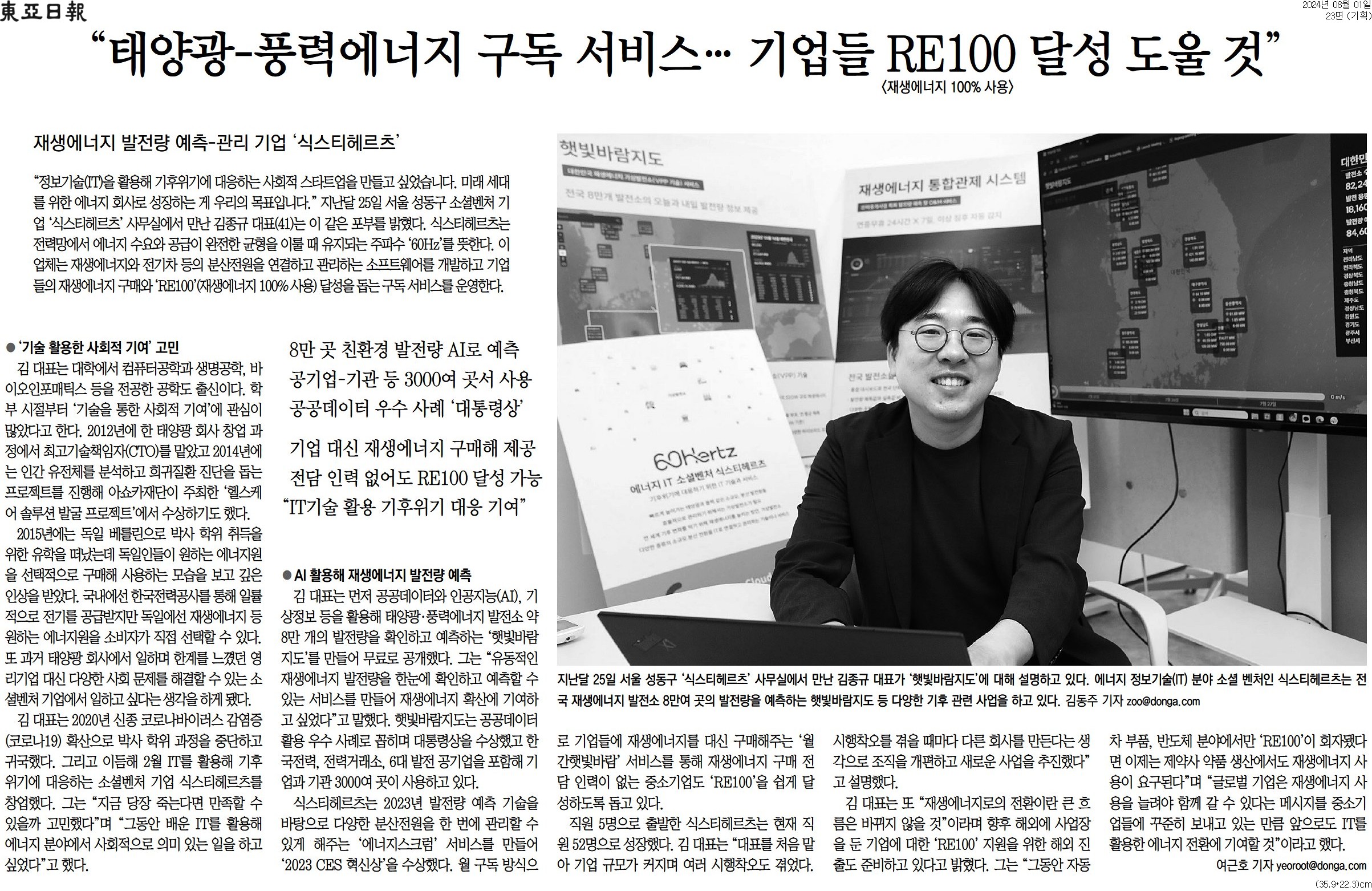 [동아일보 행복나눔] “태양광-풍력에너지 구독 서비스… 기업들 RE100 달성 도울 것”