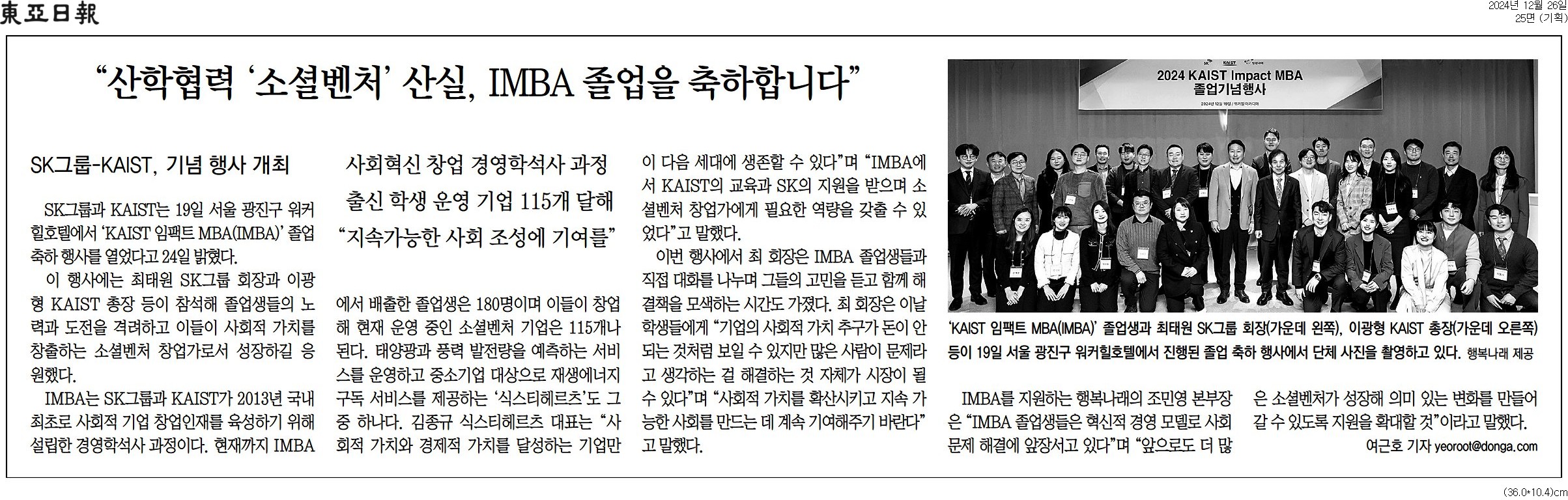 [동아일보 행복나눔] “산학협력 ‘소셜벤처’ 산실, IMBA 졸업을 축하합니다”
