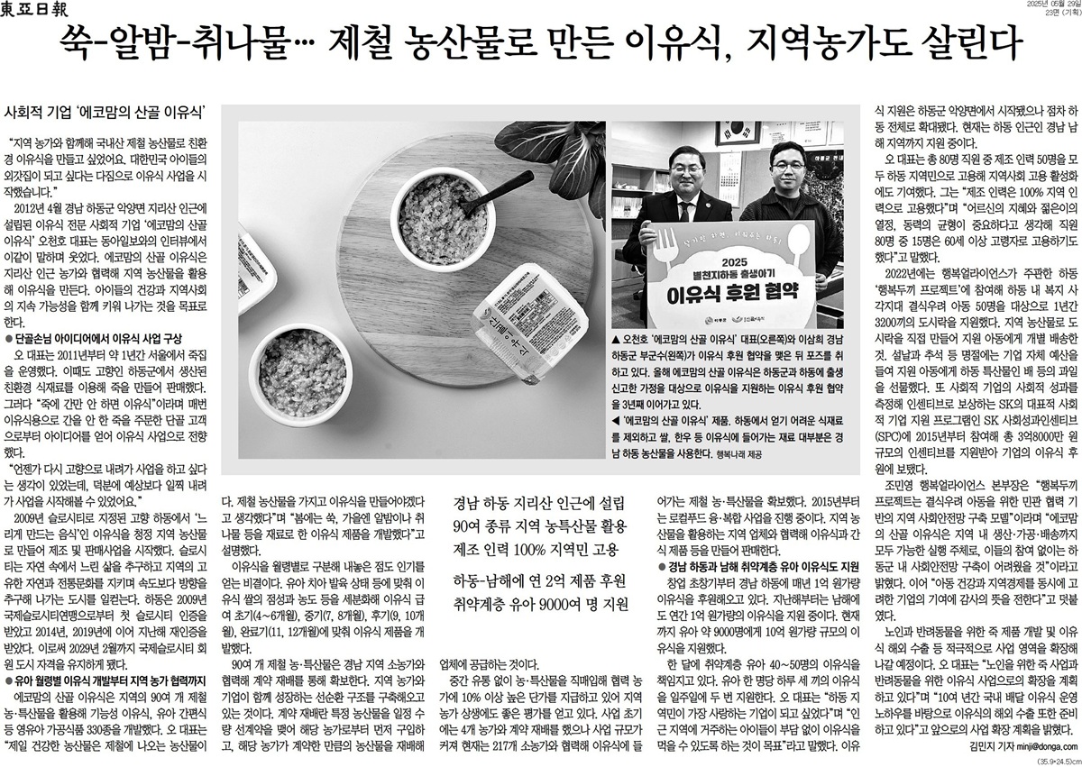 [동아일보 행복나눔] 쑥-알밤-취나물… 제철 농산물로 만든 이유식, 지역농가도 살린다