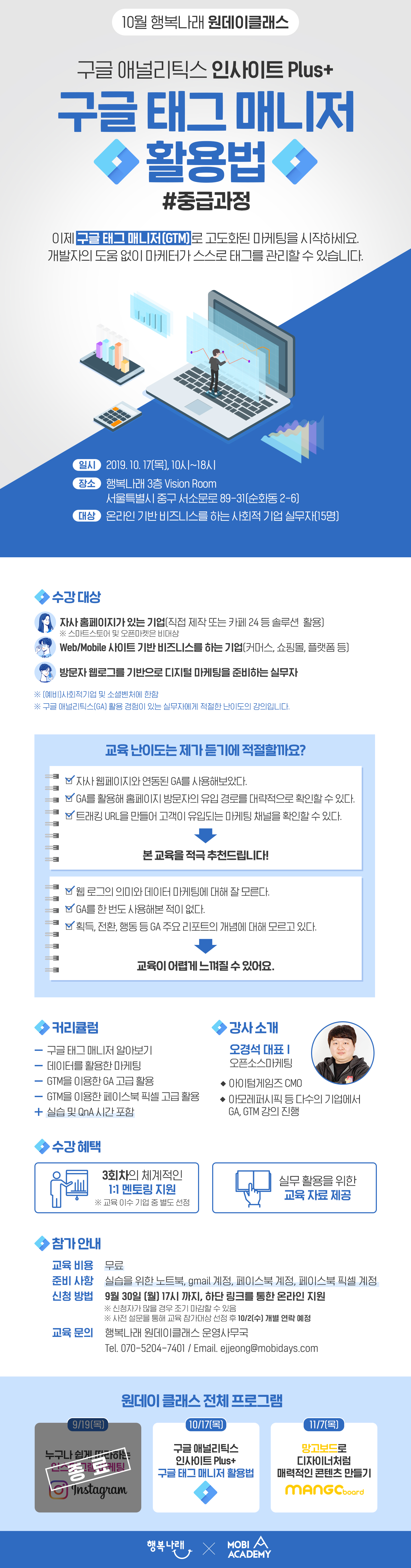 오는 10월에는 지난 구글애널리틱스 과정의 후속으로 ‘구글 태그매니저(GTM) 활용법’ 교육을 진행하오니, 많은 분들의 관심과 참여 부탁드립니다 :)