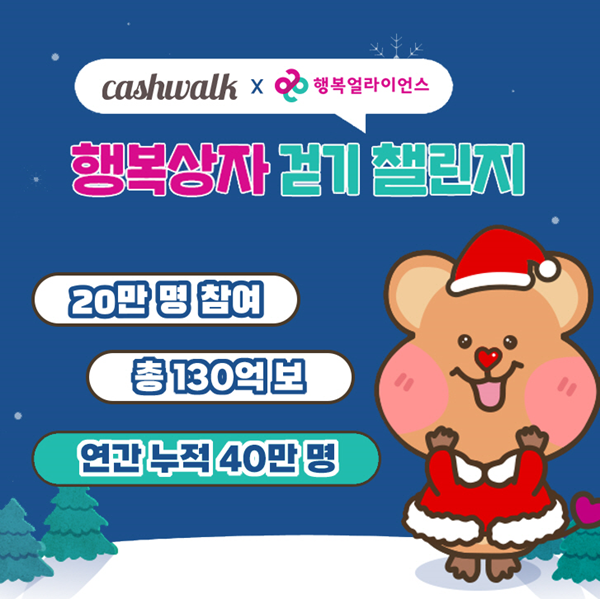 [2023.12.22] 사회공헌 네트워크 행복얼라이언스가 결식우려아동의 건강한 성장을 위해 넛지헬스케어㈜가 운영하는 건강관리 앱 캐시워크의 B2B∙B2G 플랫폼 ‘팀워크(TeamWalk)’와 협업해 지난 11일부터 17일까지 7일간 진행한 시민 참여 기부 캠페인을 성황리에 종료했다고 밝혔다.